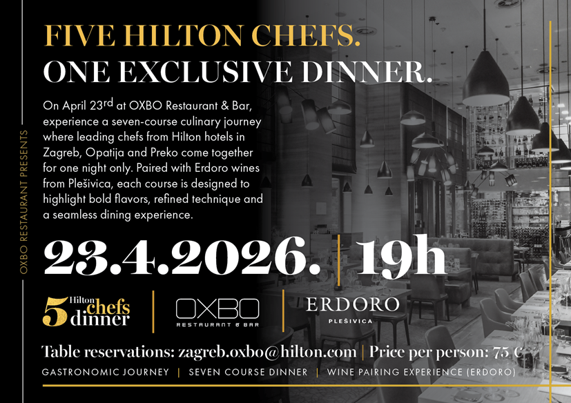 On April 23rd, OXBO Restaurant & Bar at DoubleTree by Hilton Zagreb hosts a one-night dining experience that brings together five Hilton chefs from Zagreb, Opatija and Preko (Ugljan Island), united under the concept “5 Hilton hotels, 5 chefs, 1 dinner.”